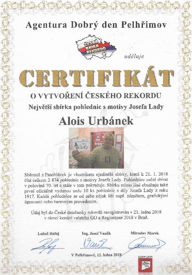 V sobotu jsem byl na veletrhu Regiontour v Brně hostem na stánku Muzea rekordů a kuriozit Pelhřimov, kde mně předali aktualizovaný certifikát o ustanovení českého rekordu v počtu pohlednic s motivy J. Lady v mé sbírce.(text psaný AU k datu 22.01.2018)