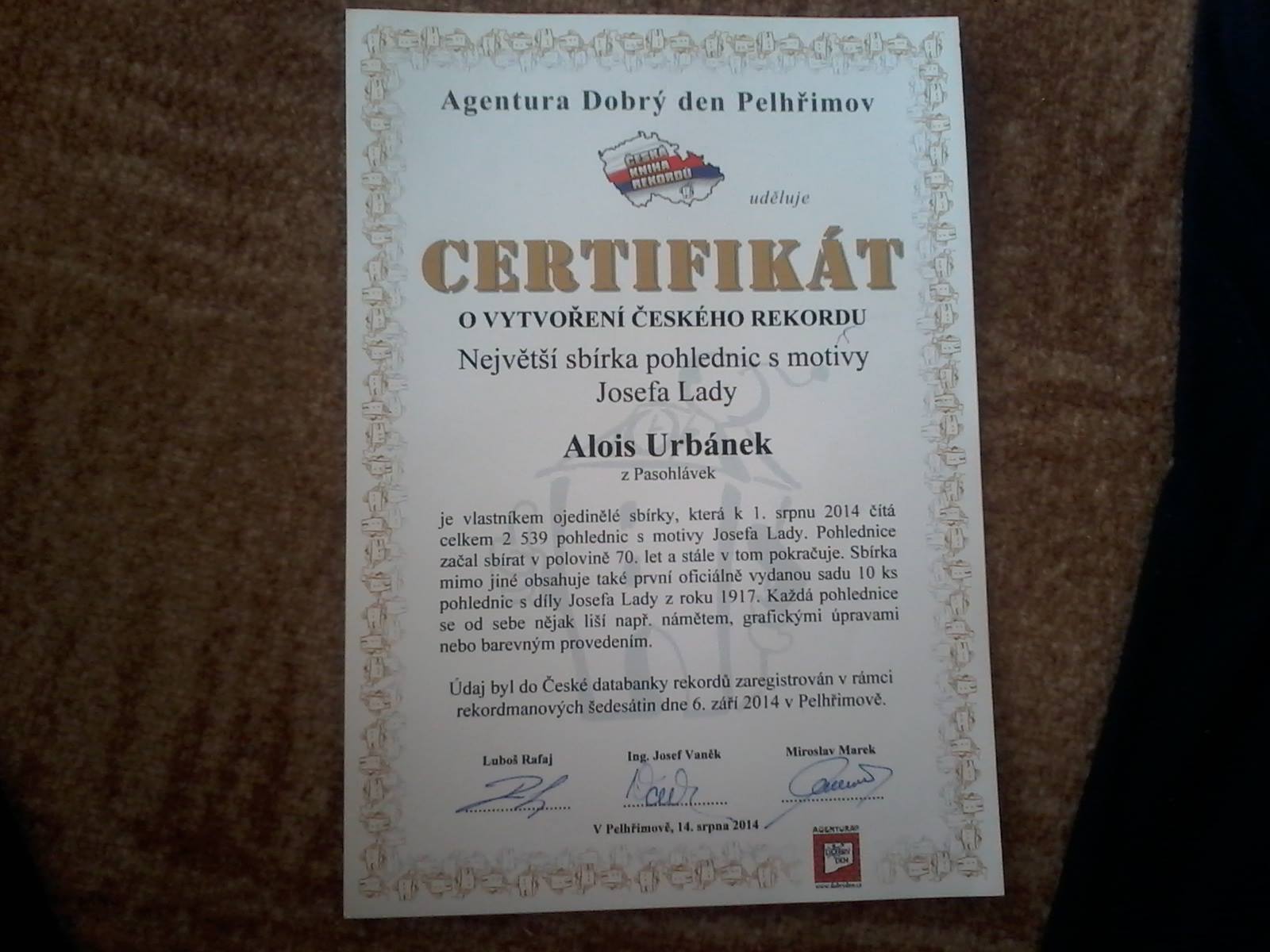 Certifikát Agentury Dobrý den z Pelhřimova z roku 2014, potvrzující zaregistrování největší sbírky pohlednic s dílem Josefa Lady. Tehdy jsem měl ve sbírce 2 539 kusů ladovek.